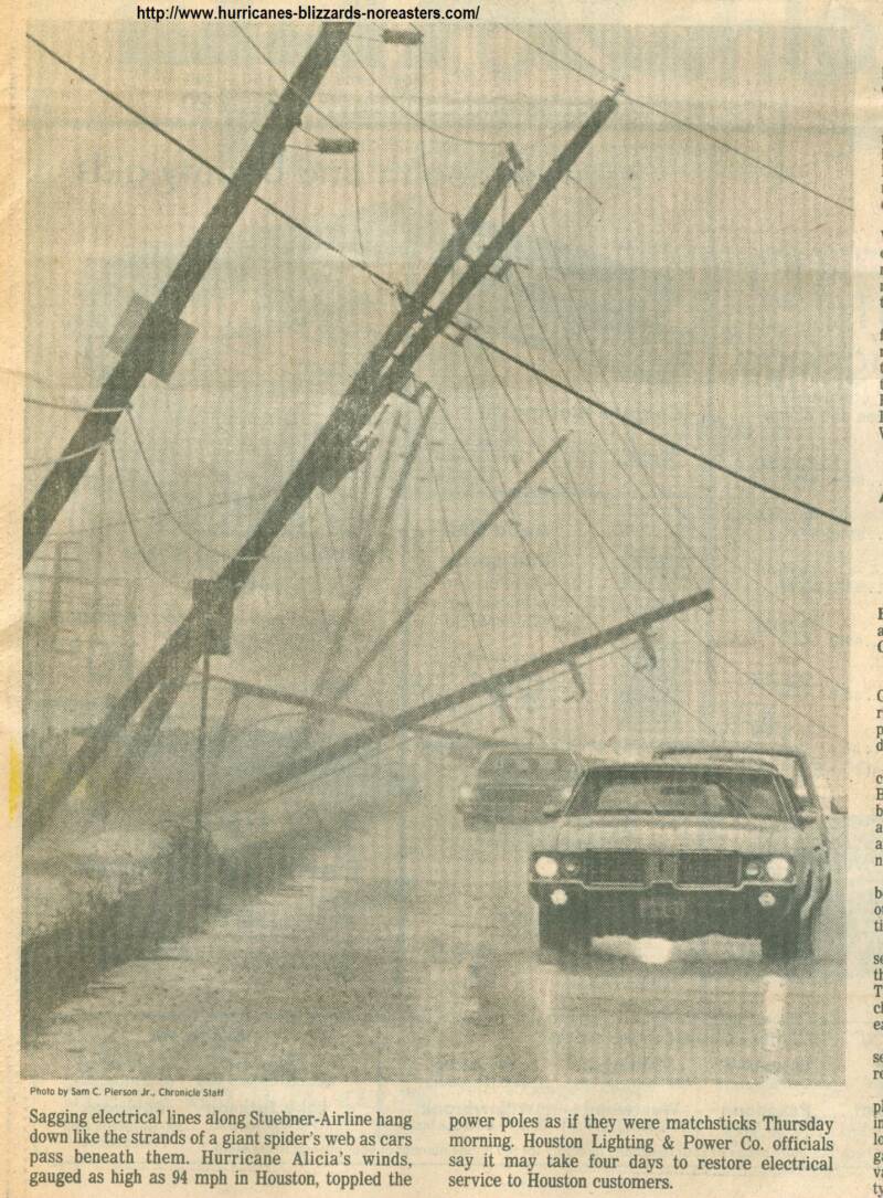 Some unusual aspects of Hurricane Alicia that are documented in this report include its rapid strengthening in the 12 to 18 hours prior to landfall, its rather sharp turn to the right (toward the northnorthwest) during the afternoon of August 17, and the double concentric eyewalls of the hurricane during the few hours prior to and just after landfall. Also, Hurricane Alicia was the first storm for which a new "probability" system of predicting hurricane landfall was used